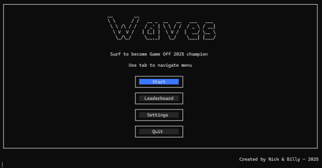 This project has been created for the Github Gameoff 2025 where the them was Waves. We wanted to try using RazorConsole in a project and this one seems like a great idea. This is effectively a full game engine written to run in a console app with physics based movement etc.